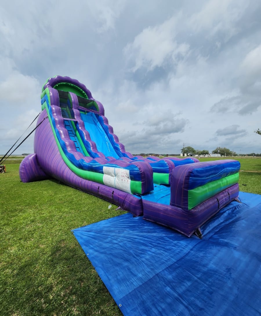 Our 22' Voodoo water slide rental will bring magical fun to your event! With its bold purple and lime green colors, this eye-catching slide is sure to stand out.
