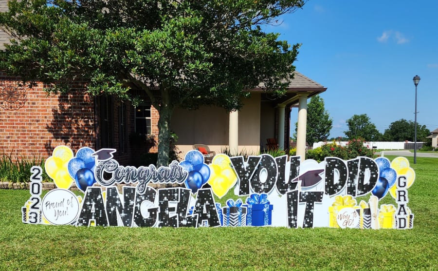 Select this sign if you’d like a large, 2-row yard card customized with the honoree’s name—perfect for celebrating a special occasion in a big way! All images on our website showcase our actual inventory.