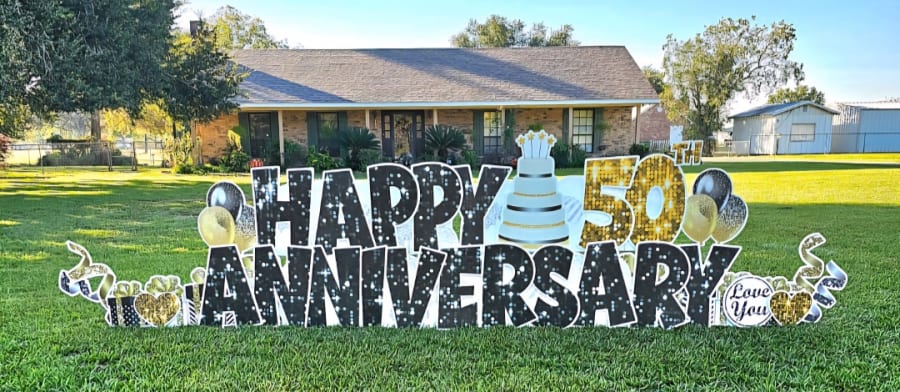 This anniversary yard card will be two rows high, making sure everyone in town knows love is still going strong! All the images on our website show our actual inventory, so no surprises here—just good times and great signs.