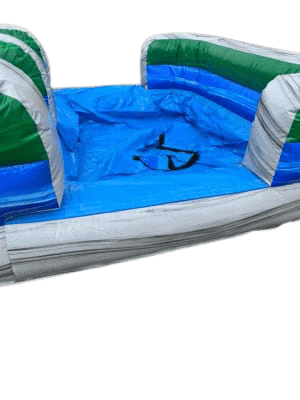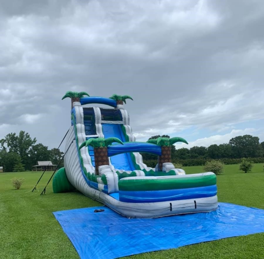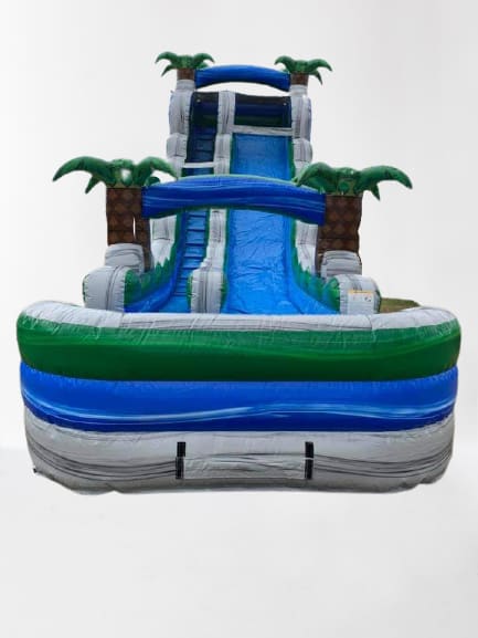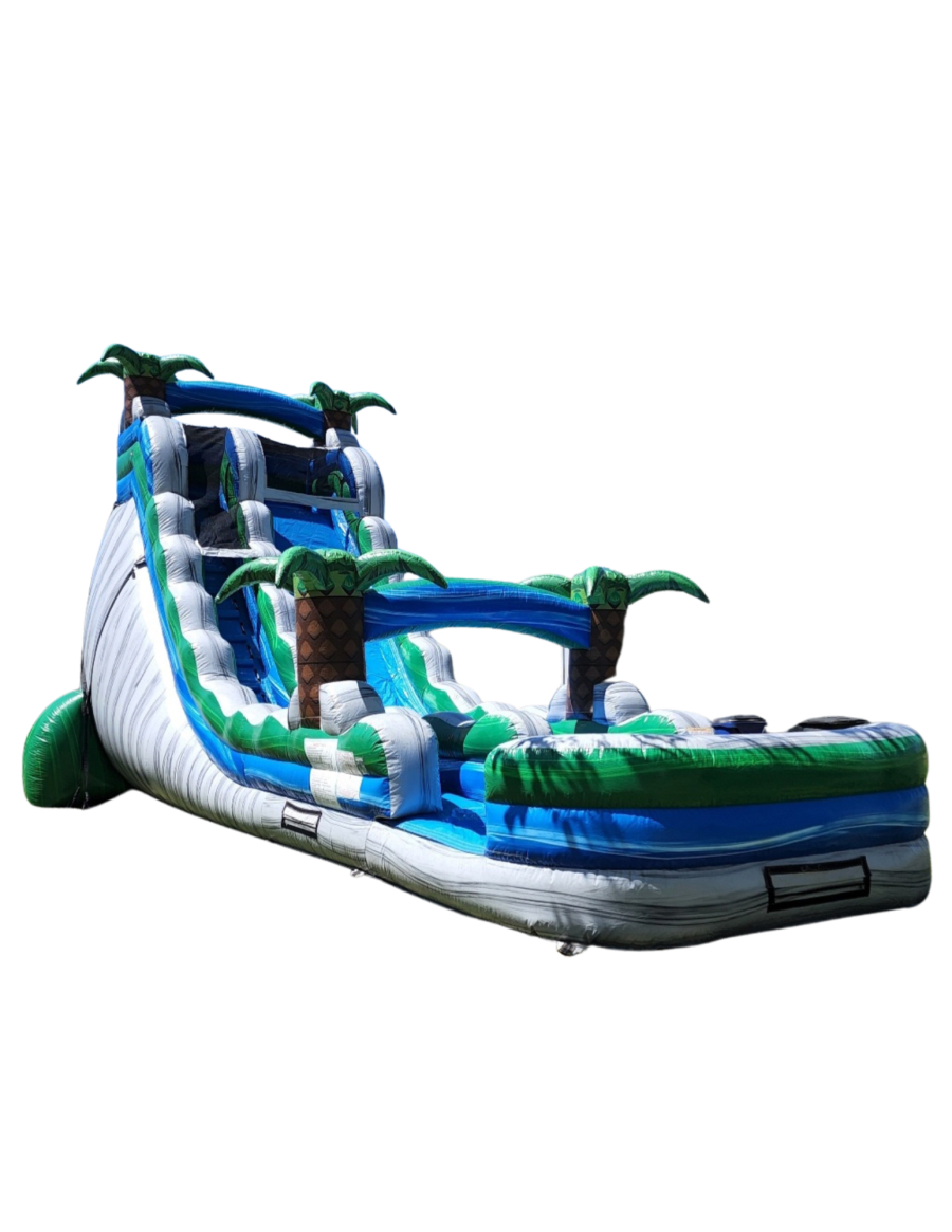 Make a splash with our 22' water slide rental! Featuring a bold blue and green color combo with tropical palm trees, this slide brings island vibes to any event.