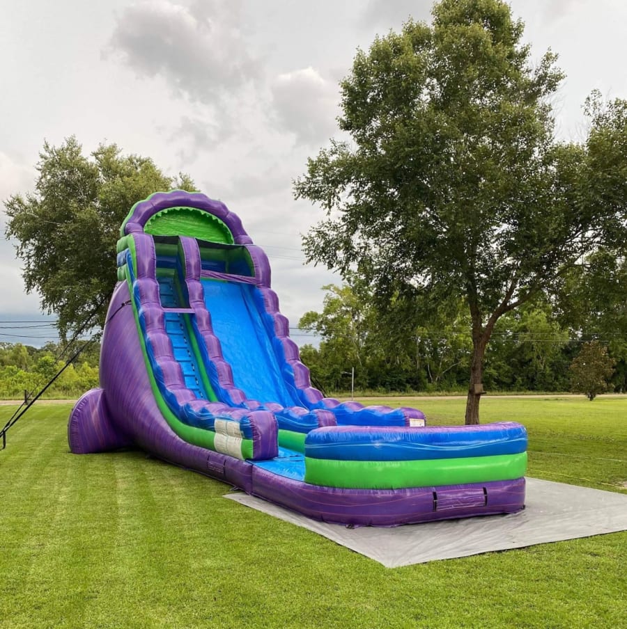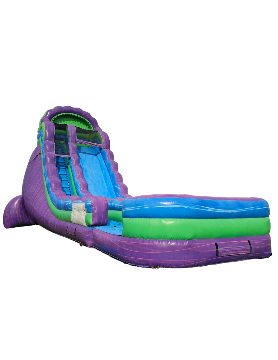 Our 22' Voodoo water slide rental will bring magical fun to your event! With its bold purple and lime green colors, this eye-catching slide is sure to stand out.