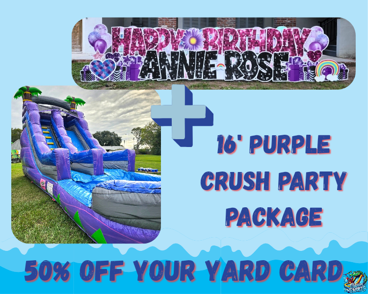 When you choose one of our Party Packages, you get to add a yard card to your inflatable rental for 50% OFF!!!